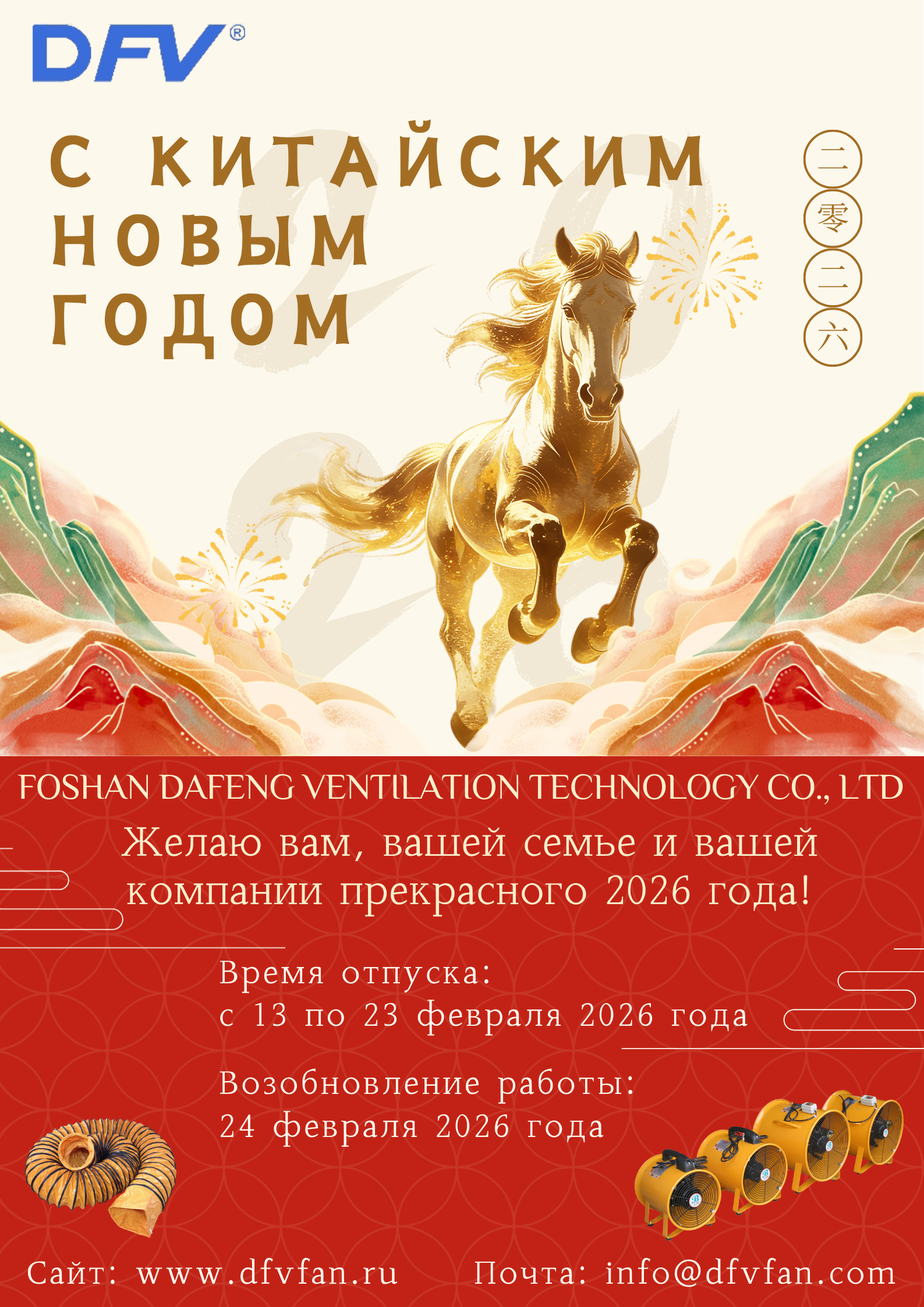 Золотая Змея уступает место уходящему году, а стремительный Конь мчится навстречу новой весне! Команда Foshan Dafeng Ventilation Technology Co., Ltd. (ООО «Фошань Дафенг Вентиляционная Технология») от всей души поздравляет вас с наступающим Китайским Новым годом — праздником Весны, который в 2026 году отмечается как Год Лошади! Этот самый важный и радостный праздник в Китае символизирует обновление, семейное тепло и надежды на процветание в будущем.